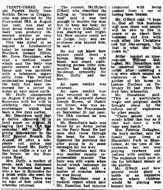 A year later, three inquests occurred on the same day for three persons murdered by the IRA in Derry, including 9 years old William Gallagher of Creggan: