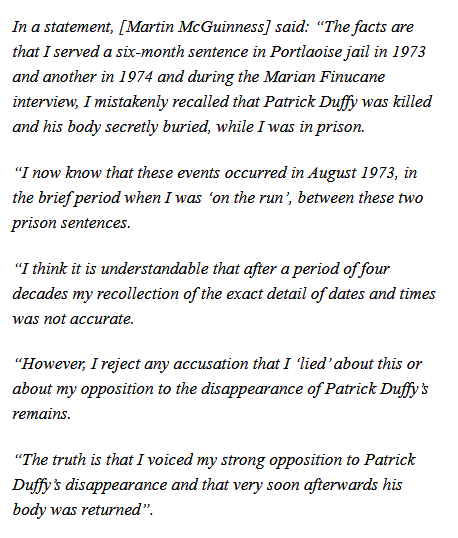 Believing that no-one would contradict his enormous lies – or that few would be able to remember any details to contradict him – McGuinness claimed that when Patrick Duffy was abucted, tortured and executed he was in Portlaoise prison and not involved in the matter.