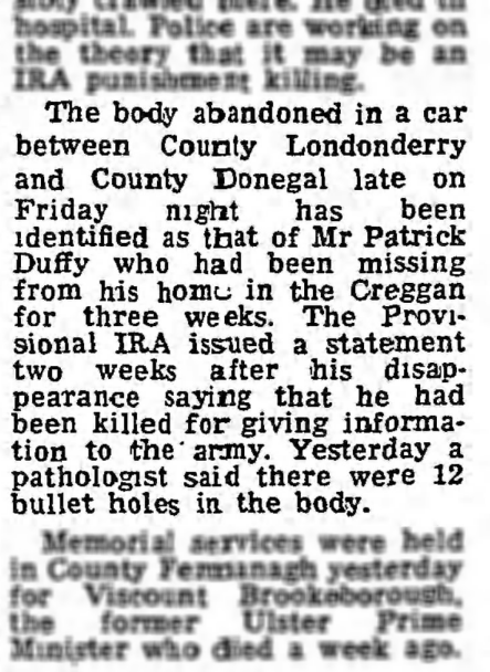 As Patrick Duffy’s wife tried to publicise her husband’s disappearance or abduction, the Derry Brigade of the IRA – that is, Martin McGuinness personally – announced in a local newspaper advert that it had executed Duffy as an informer after having tortured him into a series of admissions in Donegal.