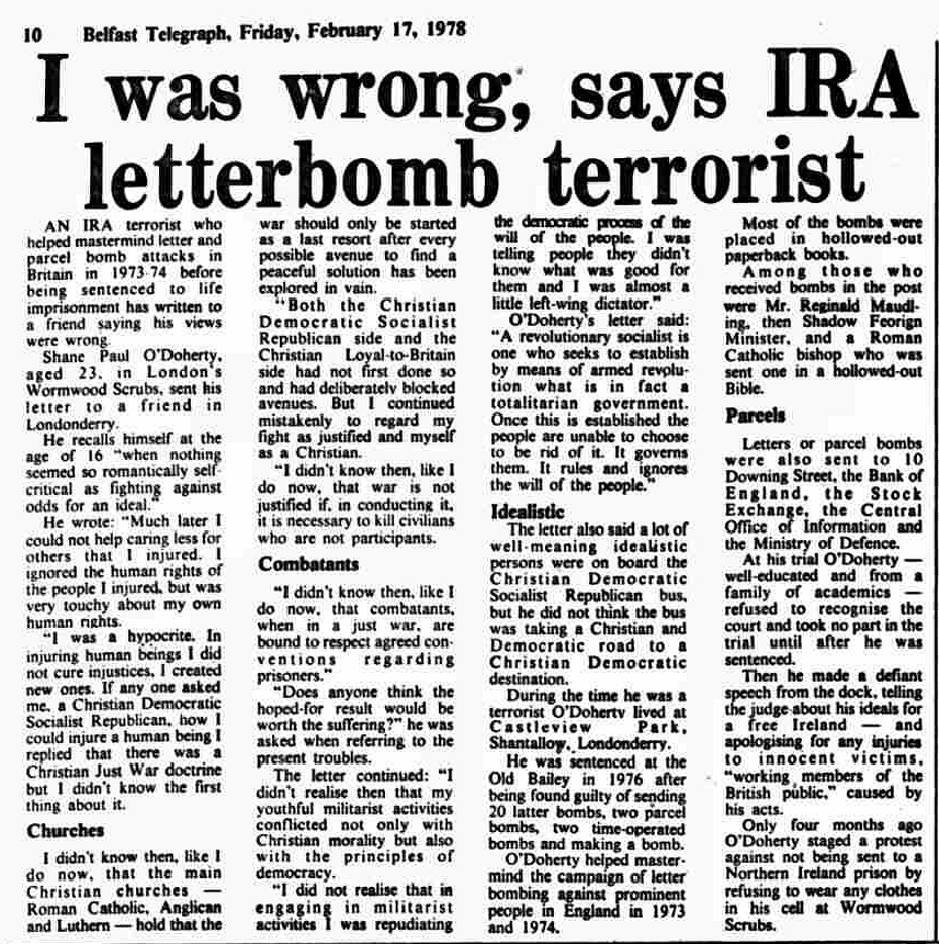 Two years later, I finally resigned publicly from the IRA and penned letters of apology to my victims – a matter that caused the IRA prisoners in the English prisons to “blank” me for the next 8 years before I was transferred back to Northern Ireland.