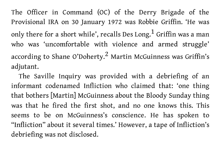 [Robbie Griffin got the job, but within months of his appointment, Bloody Sunday happened and Robbie – to his credit – had a massive row with his Adjutant Martin McGuinness about McGuinness’ unauthorised bomb and gun activities on Bloody Sunday and Robbie resigned as a result of the row.]