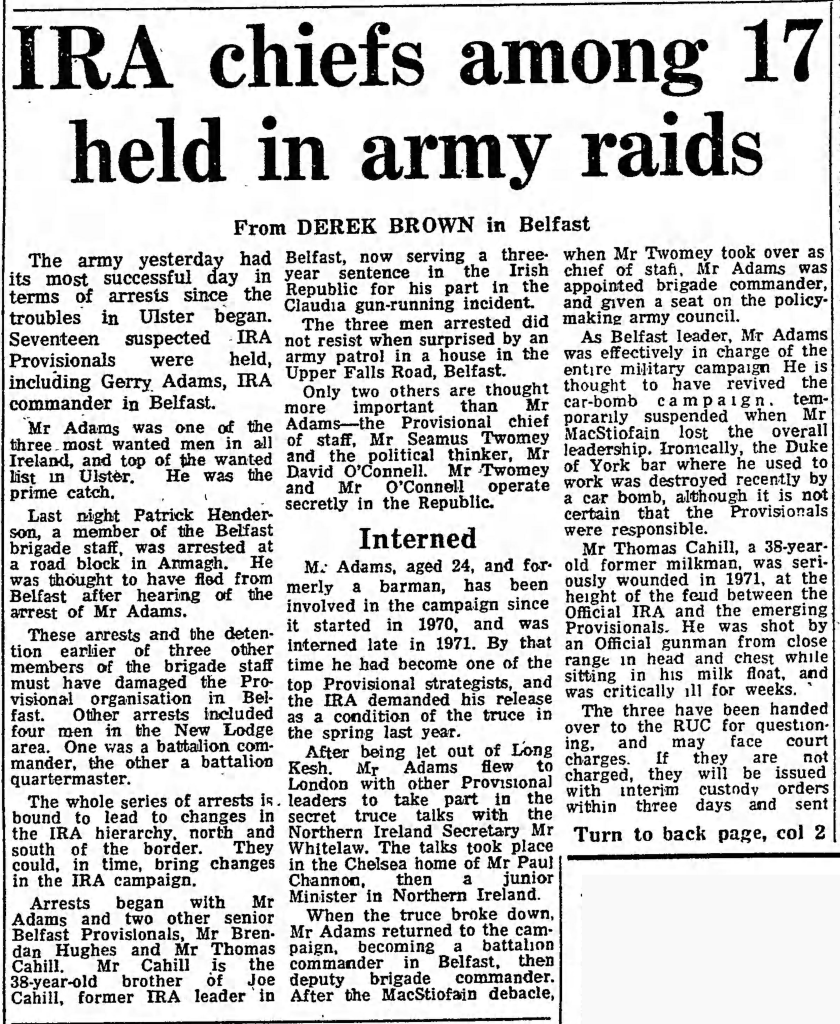 These senior IRA persons were on-the-run and ‘wanted’ by the police and army. One of them was rumoured to be Chief of Staff of the IRA and a member of the IRA’s governing Army Council. [He was arrested some time later in Belfast in a blaze of publicity.]