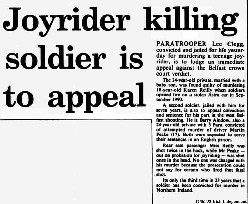 Or Private Lee Clegg’s prosecution and conviction for the murder of joyrider Karen Reilly and intent to wound Martin Peake (who later died of his injuries).
