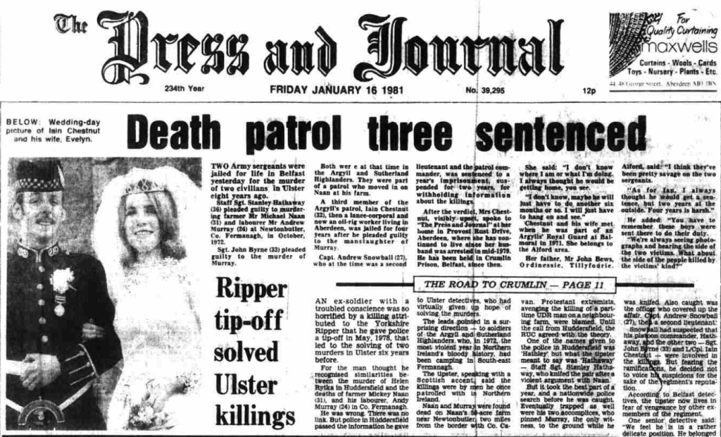 Or the “pitchfork murders” of Fermanagh farmers Michael Naan and Andrew Murray which were investigated by police as a “cold case” after 9 years and led to Argyll and Sutherland Highlanders Sergeants John Byrne and Stanley Hathaway pleading guilty and receiving life sentences, and to two others pleading guilty to lesser charges, including Captain Andrew Snowball who received a 4 year sentence.