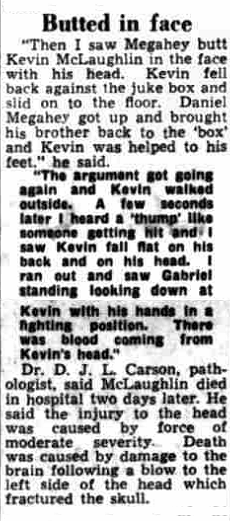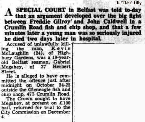 While Gabriel Megahey’s deportation from the US was later halted in the name of the ‘peace process‘, he had initially hidden from the American authorities then as now his 1962 criminal trial and conviction in Belfast for headbutting and killing 24yrs old Kevin McLaughin of Highbury Street.