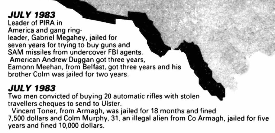 Within 2 years of Howell’s detention at Niagara Falls, Gabriel Megahey was sentenced in September 1984 to a surprisingly short 7 years in a federal penitentiary for conspiracy to ship arms to the IRA – a 7 years that could be substantially cut by good behaviour – or even by a ‘deal’ with the FBI.