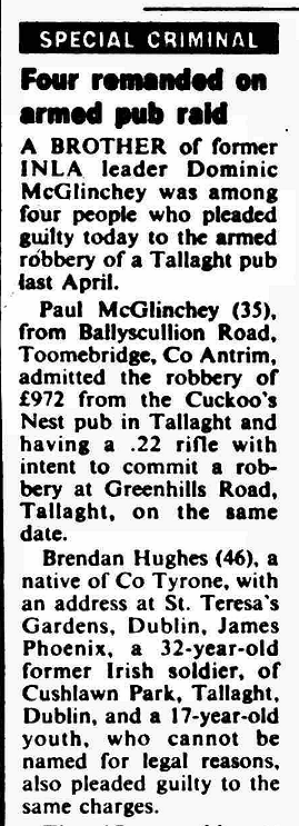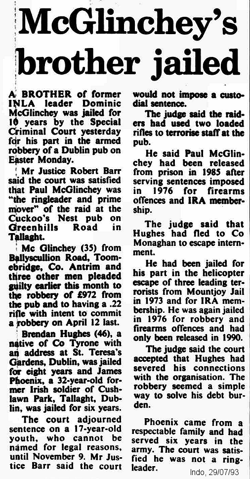 Hughes continued robbing banks until 1993 – two decades after his desertion of the IRA – when his final bank robbery [on behalf of the INLA’s “mad dog” Dominic McGlinchey] ended in his arrest and later conviction.